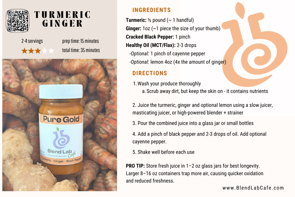 This recipe is adapted from the same ratio we use at Blend Lab Café for our Pure Gold Shot. It provides a powerful concentration of curcumin, gingerols, and piperine — with easy household measurements.